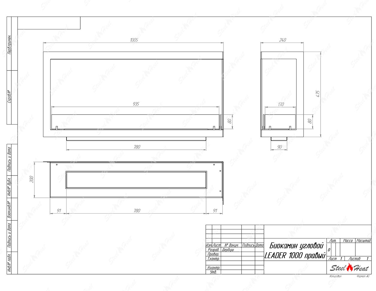 Встраиваемый Биокамин угловой SteelHeat Leader 1000 правый предназначен для встраивания в глухие ниши из гипсокартона, кирпича, пеноблоков, бетона.